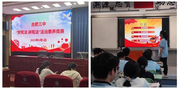 合肥三中历来高度重视校园法治文化建设,将宪法学习和宣传作为立德树人和法治教育的重要内容。学校积极组织全体学生参与“学宪法 讲宪法”素养竞赛与演讲比赛,通过常态化开展国旗下主题讲话、召开主题班会、举办知识讲座等多种形式,营造尊崇宪法、学习宪法的浓厚校园氛围,有效提升了学生的法治意识和公民素养,为学生的全面发展奠定了坚实的法治基础。