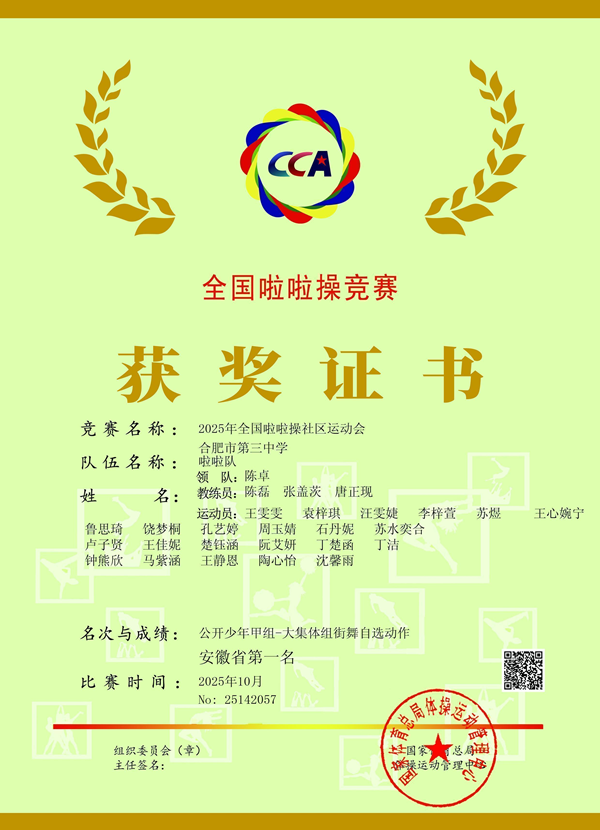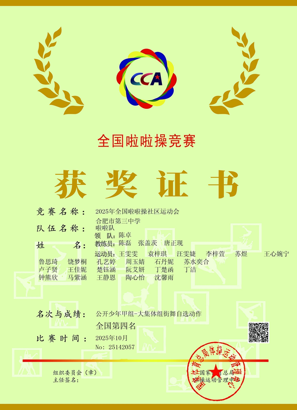 近日,2025年全国啦啦操社区运动会圆满落幕,合肥市第三中学啦啦队凭借出色的表现,在公开少年甲组大集体组街舞自选动作项目中脱颖而出,一举夺得合肥市第一名、安徽省第一名,并荣获全国第四名的优异成绩,充分展现了学校啦啦操队伍的高水平实力与青春风采。本次竞赛由国家体育总局体操运动管理中心主办,是全国啦啦操领域的高水平赛事。合肥市第三中学啦啦队在领队陈卓、教练员陈磊、张盖茨、唐正现的带领下,团结协作、奋勇拼搏,以精湛的技艺和饱满的舞台表现力赢得了裁判员们的一致认可。