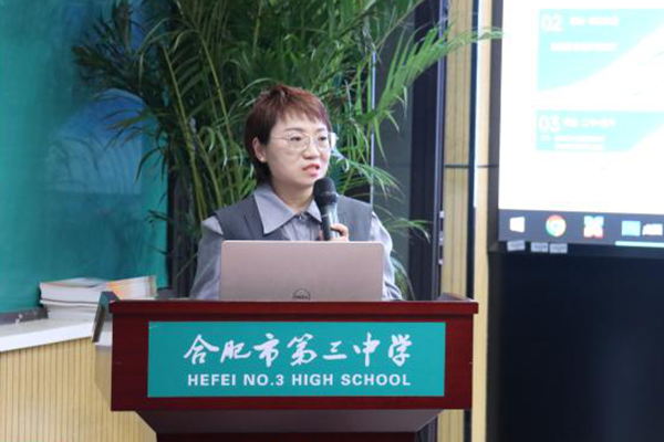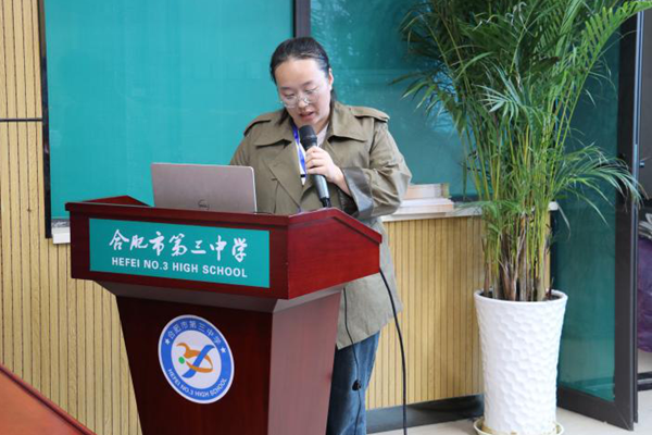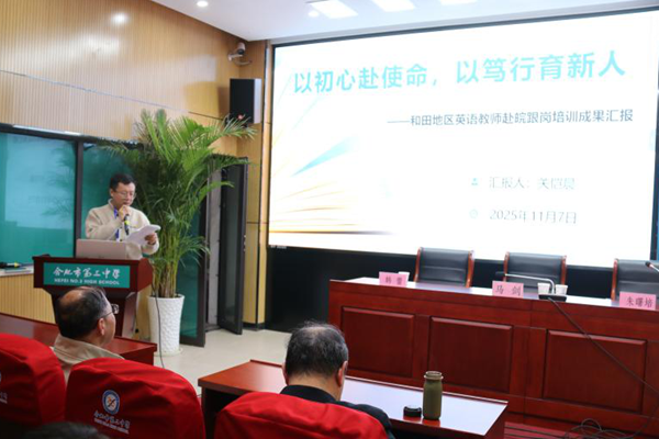 随后,和田高级中学英语教师郑小菊作为跟岗教师代表发言。她以《皖江秋雨润心田 昆仑教苑启新程》为题,回顾了在皖学习的难忘经历。她坦言,此次跟岗学习是一次珍贵的成长之旅,不仅在逆向设计教学方法、模块解构教学体系等专业技能上收获颇丰,更被合肥三中指导老师的倾心相授所感动。她表示,将把在皖所学的先进教育理念和教学方法带回和田,融入日常课堂教学,让教育的种子在昆仑山下发芽结果,为当地教育事业发展注入新活力。