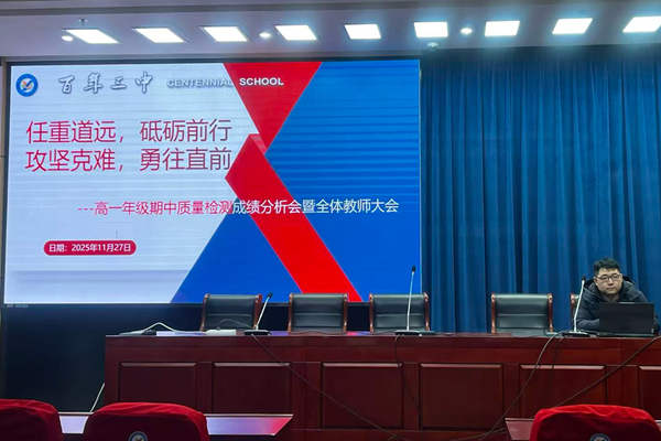 为精准剖析期中教学成效,明确下一阶段教学方向,2025 年 11 月 27 日 ,合肥三中高一年级期中质量检测分析会暨全体教师大会在君尧楼二楼顺利召开。本次会议以 “任重道远,砥砺前行 攻坚克难,勇往直前”为主题,副校长陈卓、张黎明及高一年级全体教师参会,共同复盘教学成果、梳理现存问题、谋划提质路径。