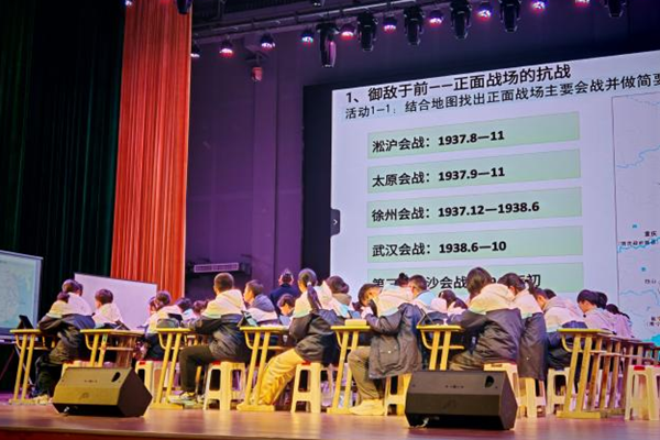 活动伊始:由来自合肥一中历史教师胡雪芳以《全民族浴血奋战与抗日战争的胜利》为题,展开了一堂富有情感张力与技术融合的示范课。她以安徽诗人田间的《假使我们不去打仗》诗句导入,迅速激发学生共鸣。整节课围绕“宁死不屈:万众一心的浴血奋战”“正义必胜:举足轻重的东方战场”“瞩目中华:浴火重生的中国复兴”三大篇章展开,设计了层次清晰的学习任务。胡老师充分挖掘本土资源,结合合肥大蜀山烈士陵园、杏花公园将军雕像、芜湖戴安澜墓等地方历史遗迹,创设贴近学生的历史情境。在技术应用上,她通过AI还原抗战时期庐州中学转移场景,利用H5互动时间轴游戏培养学生时空观念,并借助AI智能助教对学生的目录仿写作业进行个性化点评与指导。课堂还引入“抗战意义即时词云”,将学生作答内容可视化,有效提升了课堂反馈的即时性与互动性。