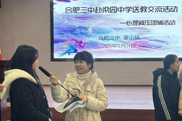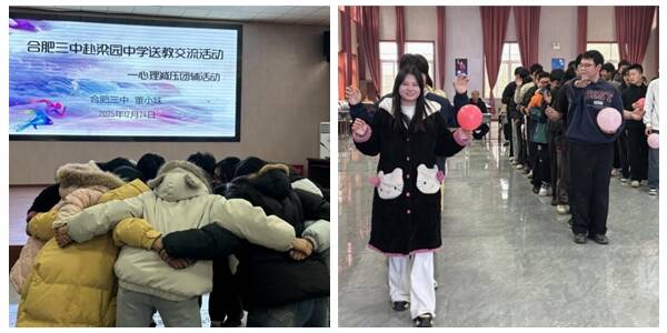 合肥三中心理健康教师董小妹以“赋能悦身心 乘风向未来”为主题,为同学们带来了一场别开生面的心理团辅课。通过“几人几脚”“花开花落”等协作游戏,同学们迅速融入集体,在欢笑中增进信任、释放情绪;随后的“肌肉放松操”、“合力运气球”则引导大家互相关心、增强团队凝聚力。整场活动动静结合、设计科学,帮助学生缓解学业压力,培养积极阳光的心态。