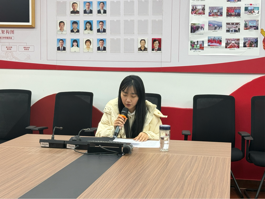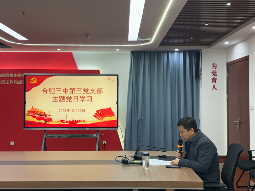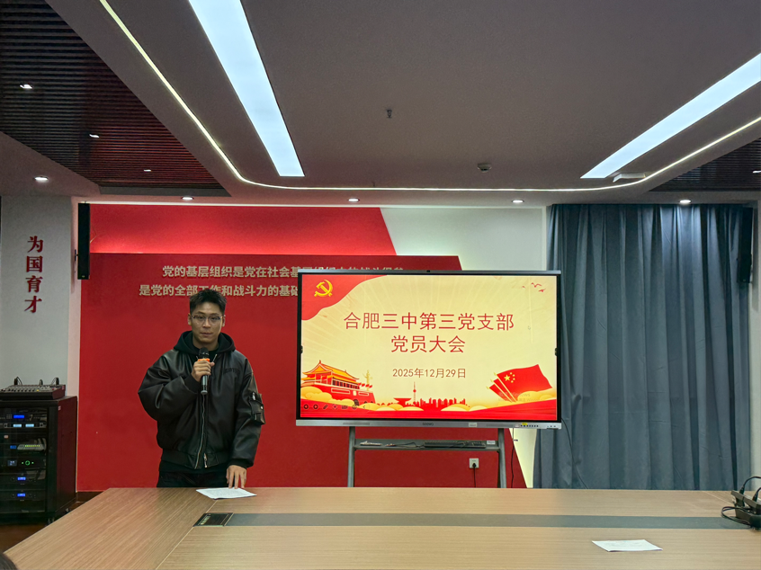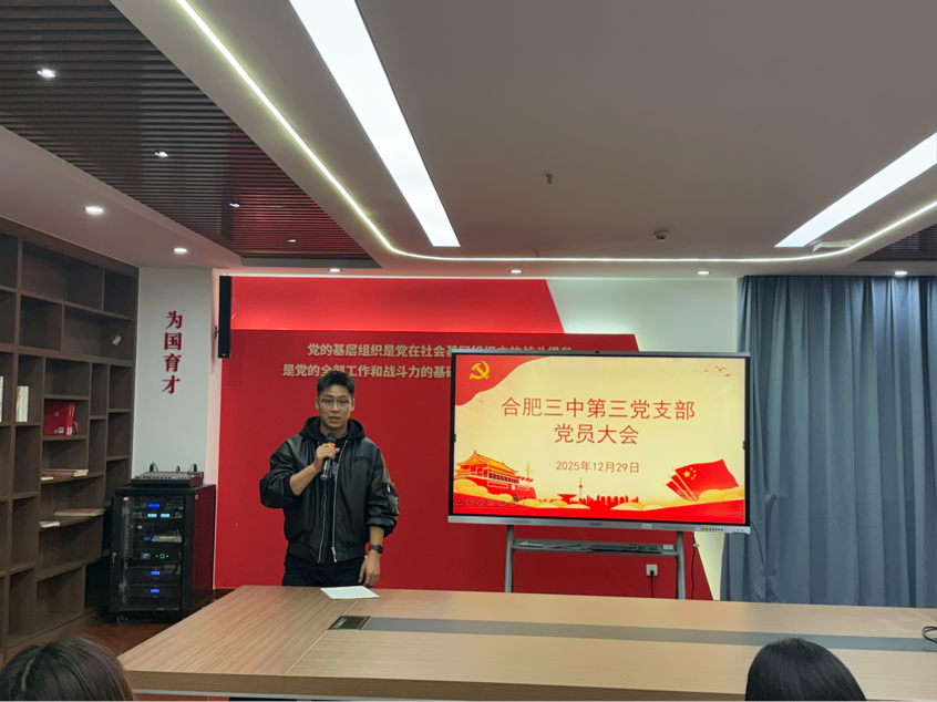 为深入学习贯彻习近平新时代中国特色社会主义思想,强化党员教师的使命担当,2025年12月29日,合肥三中第三党支部召开了十二月主题党日暨党员大会,会议由支部书记郑书建主持。