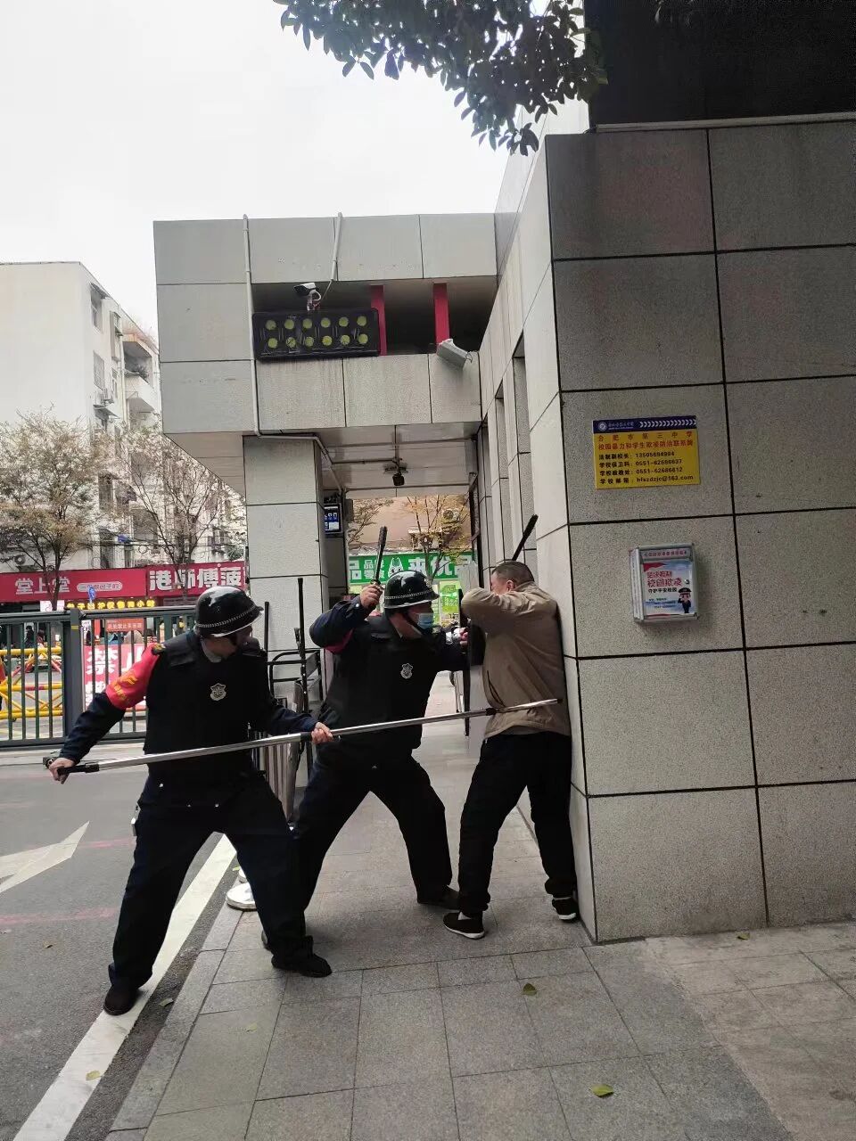 演练前,逍遥津派出所民警结合校园安防特点与典型案例,对安保人员开展专项培训,系统讲解暴恐事件识别预警、一键报警规范、现场封控流程、人员疏散引导等要点,重点示范防暴盾牌、防暴钢叉、约束装备的使用规范与战术配合,明确“先控险、再制敌、保安全”的处置原则。本次演练模拟校外可疑人员持械强行闯入校园的突发场景。指令下达后,安保人员迅速响应,第一时间启动应急预案、触发一键报警,按战术编组快速抵达现场,形成封控与处置梯队。队员们手持防暴器械,密切配合、果断处置,有效阻拦、牵制并制服“可疑人员”,全程动作规范、响应迅速、配合默契,圆满完成模拟处置任务。民警全程跟踪指导,针对站位、器械使用、协同配合等环节即时纠偏、现场点评,进一步强化安保人员实战技能。
