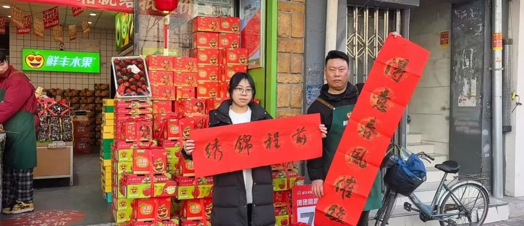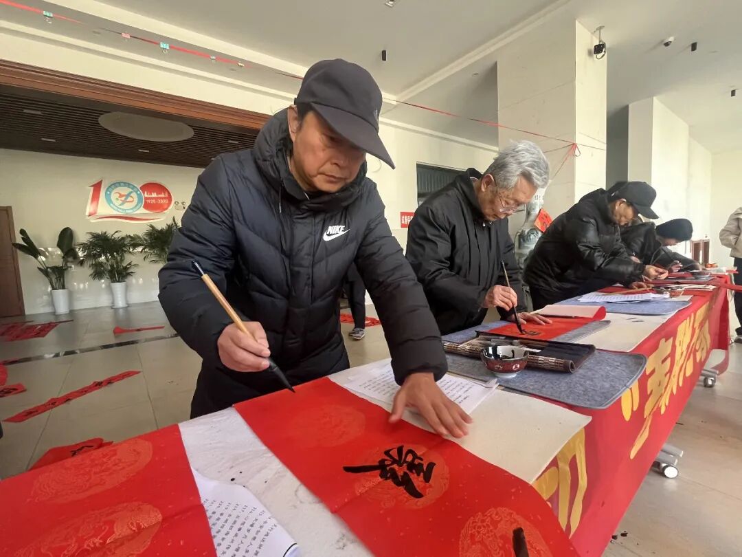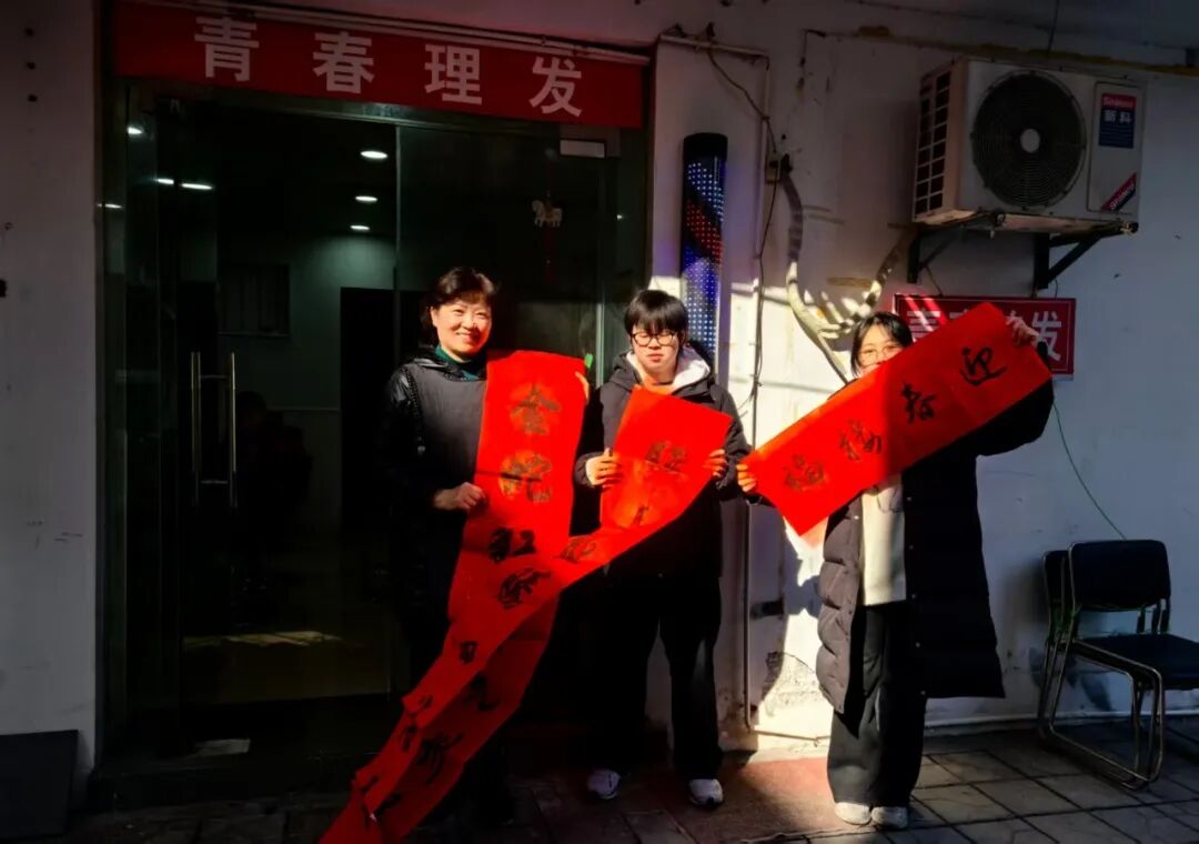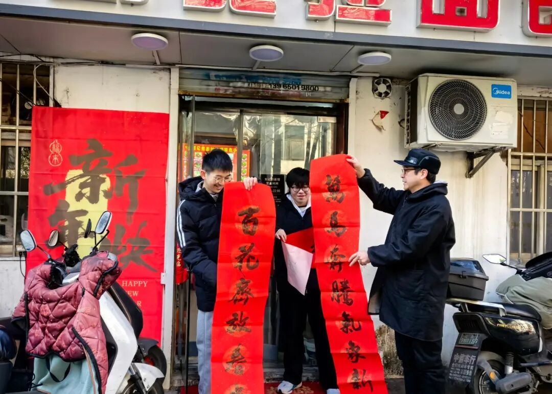 当日上午9时30分,“春联万家・策马启新” 免费赠春联活动在合肥三中正谊会堂门厅正式拉开帷幕。活动现场暖意融融,墨香四溢。合肥三中负责统战部工作的副校长张黎明亲临现场指导,民进开明书画院专家、支部7 位书法爱好者与学校书法社学子携手挥毫泼墨,将美好的新春祝福倾注于笔端。活动期间,民进合肥三中支部主委张丽等和三中书法社的学子们一同走进周边社区与商铺,将刚写好的春联送到经营者和社区居民手中。从白发苍苍的老者到朝气蓬勃的学子,从社区住户到沿街商户,大家手捧红彤彤的春联,脸上洋溢着幸福的笑容,现场一派欢乐祥和的节日氛围。赠春联活动持续至11时30分圆满结束。