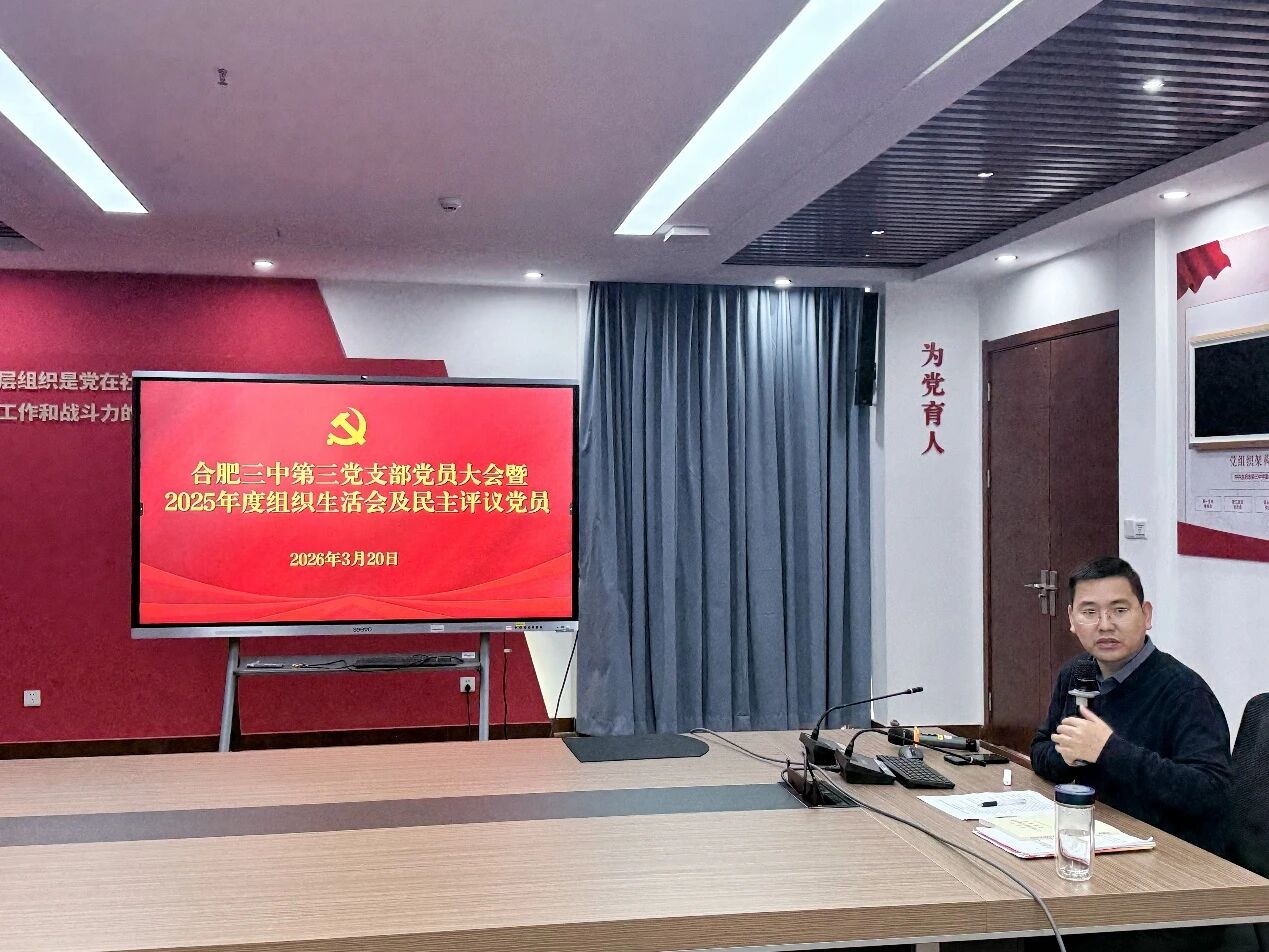 为持续强化理论武装,严肃党内政治生活,切实提升党支部凝聚力与战斗力,2026年3月20日,合肥三中第三党支部召开党员大会暨2025年度组织生活会,并同步开展民主评议党员工作。会议紧扣主题、程序规范,推动全体党员以更高标准锤炼党性、改进作风,以实干实绩践行教育工作者的初心使命。