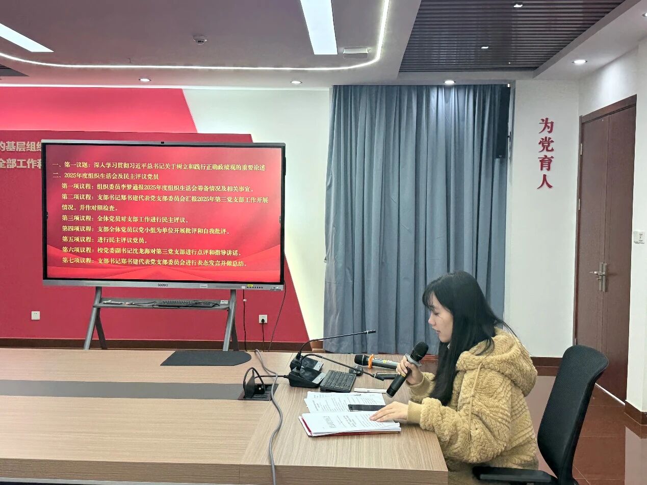 本次组织生活会及民主评议党员工作严格按照既定议程有序推进,支部组织委员李梦首先通报2025年度组织生活会筹备情况及相关事宜,明确会议要求、评议规则与工作安排,为会议有序开展奠定坚实基础。随后,支部书记郑书建代表党支部委员会,全面汇报2025年第三党支部工作开展情况,围绕思想建设、组织建设、师德师风、教育教学融合等方面系统总结成效、深入查摆不足,并代表支委会作对照检查,明确了具体整改方向与落实举措。