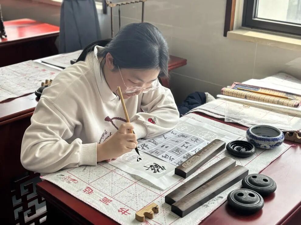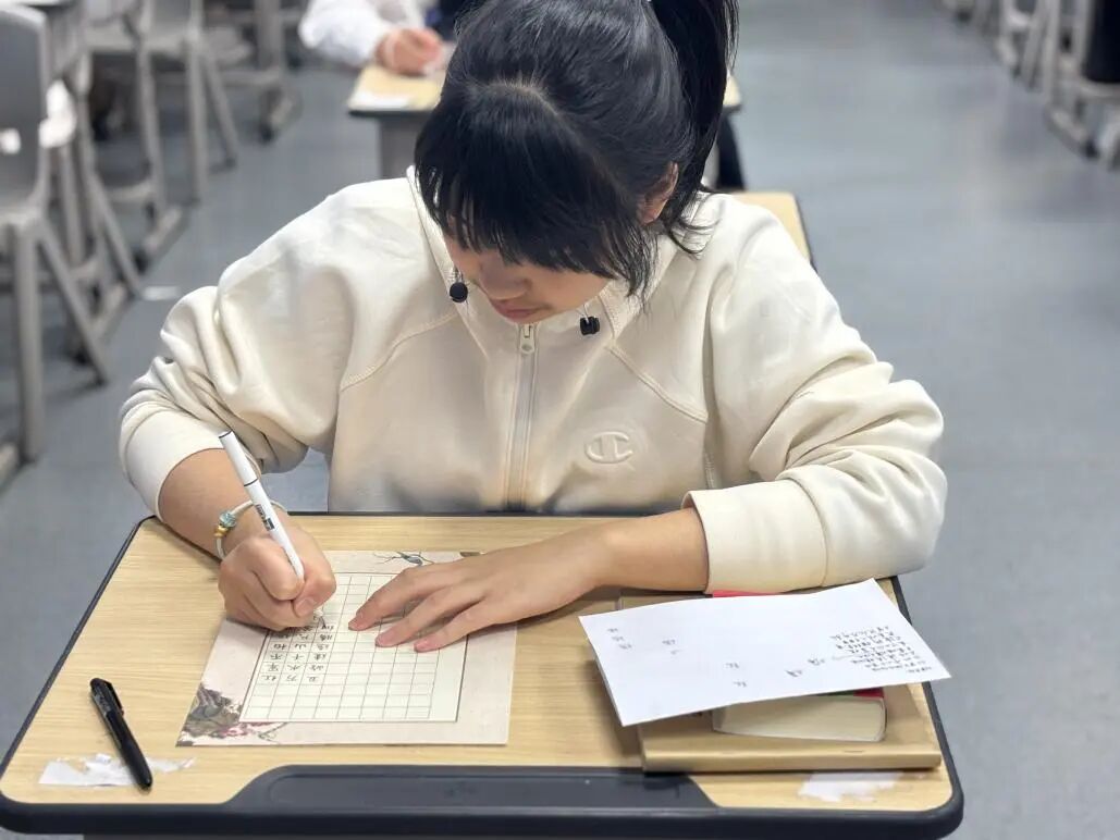 3月26日中午,大赛正式拉开帷幕。现场气氛热烈而有序,同学们踊跃参与,或伏案疾书,或凝神静思。硬笔书法区,同学们笔力遒劲、字迹工整,一首首经典诗词在笔尖流淌;毛笔书法区,墨香四溢,同学们挥毫泼墨,书写着千古名篇,一笔一画间尽显专注与投入,现场洋溢着浓厚的文化气息。