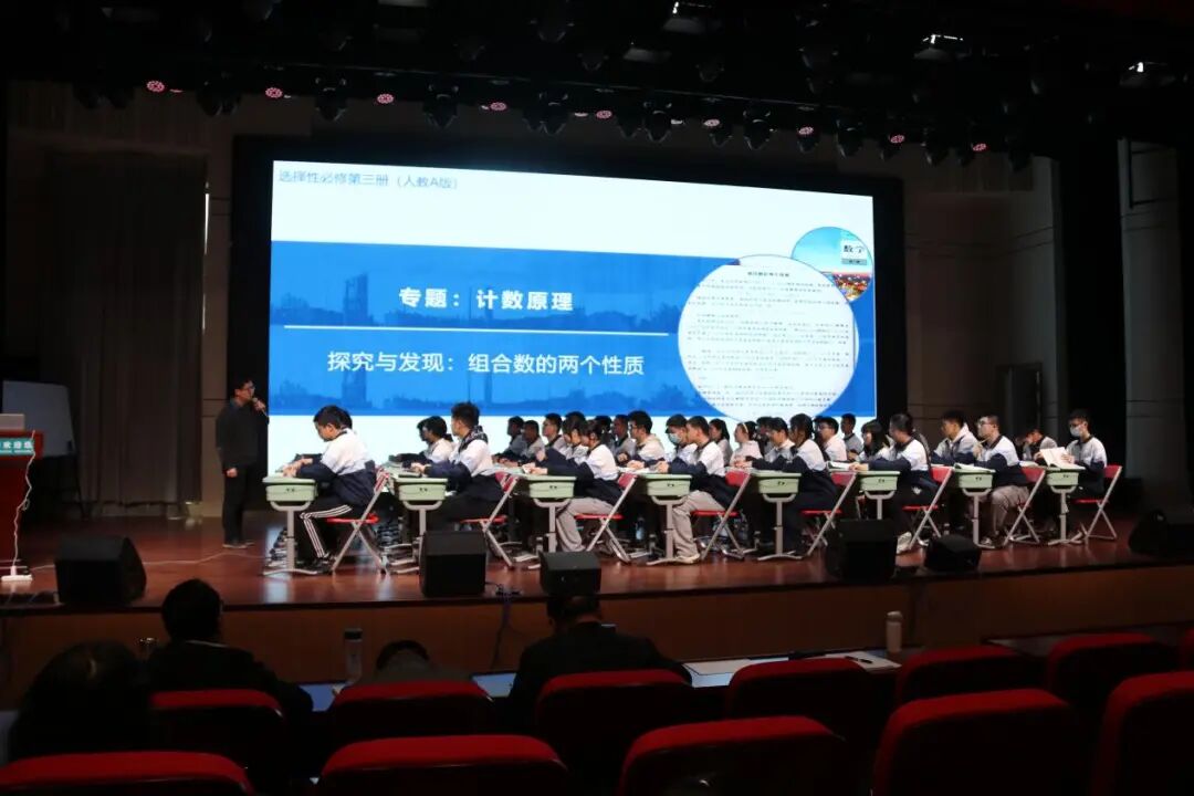第二个环节是合肥八中优秀青年教师李瑞民老师的有生上课——《探究与发现:组合数的两个性质》。课堂上,李老师以问题链驱动学生深度思考,引导学生经历”观察——猜想——证明——应用”的探究全过程,生动呈现知识生成过程,凸显学生主体地位,打造出扎实高效的探究课堂新样态。