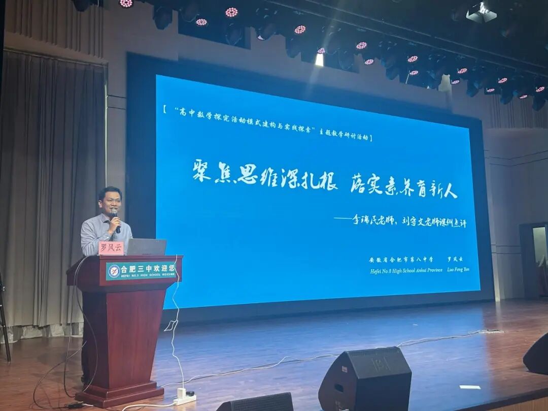 合肥八中数学学科主任罗风云老师以“聚焦思维深扎根,落实素养育新人”为主旨对两位老师的授课内容进行了专业点评,罗老师深入阐释了对教学“基础性”的理解。他立足核心素养要求,肯定了两节展示课中通过设置梯度问题串、科学分解教学难点、清晰揭示问题研究路径等亮点。