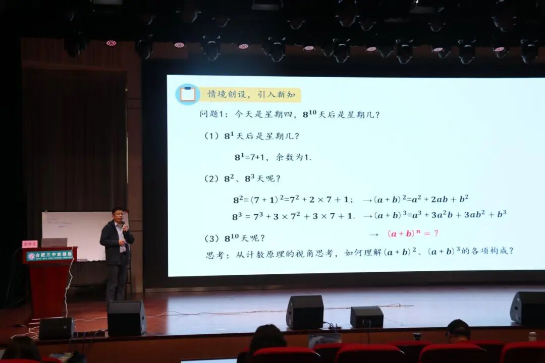 随后,合肥三中数学学科主任刘守文老师围绕《二项式定理》进行教学展示与理念阐释。刘老师创设了一致指向的教学情境链促进知识自然生成与发展,通过情境引领知识结构构建,基于课堂“微探究”促进学生理解二项式定理的内容本质。在教学阐释环节,刘老师凭借深耕一线的教研积淀对本节课的设计理念进行了深度解读,获得了与会同仁的一致肯定。