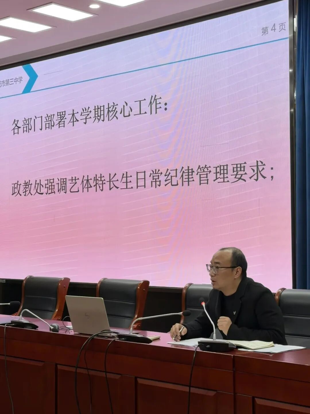 部门部署环节,各负责人结合岗位职责明确工作要求。政教处副主任束传海带领大家学习中学生法律法规及学校规章制度,重点解读手机管理等违规行为的危害与处理办法,强调特长生既要提升专业能力,也要注重品德修养和行为规范,自觉遵守校规校纪,配合学校管理,营造良好校园及训练氛围。