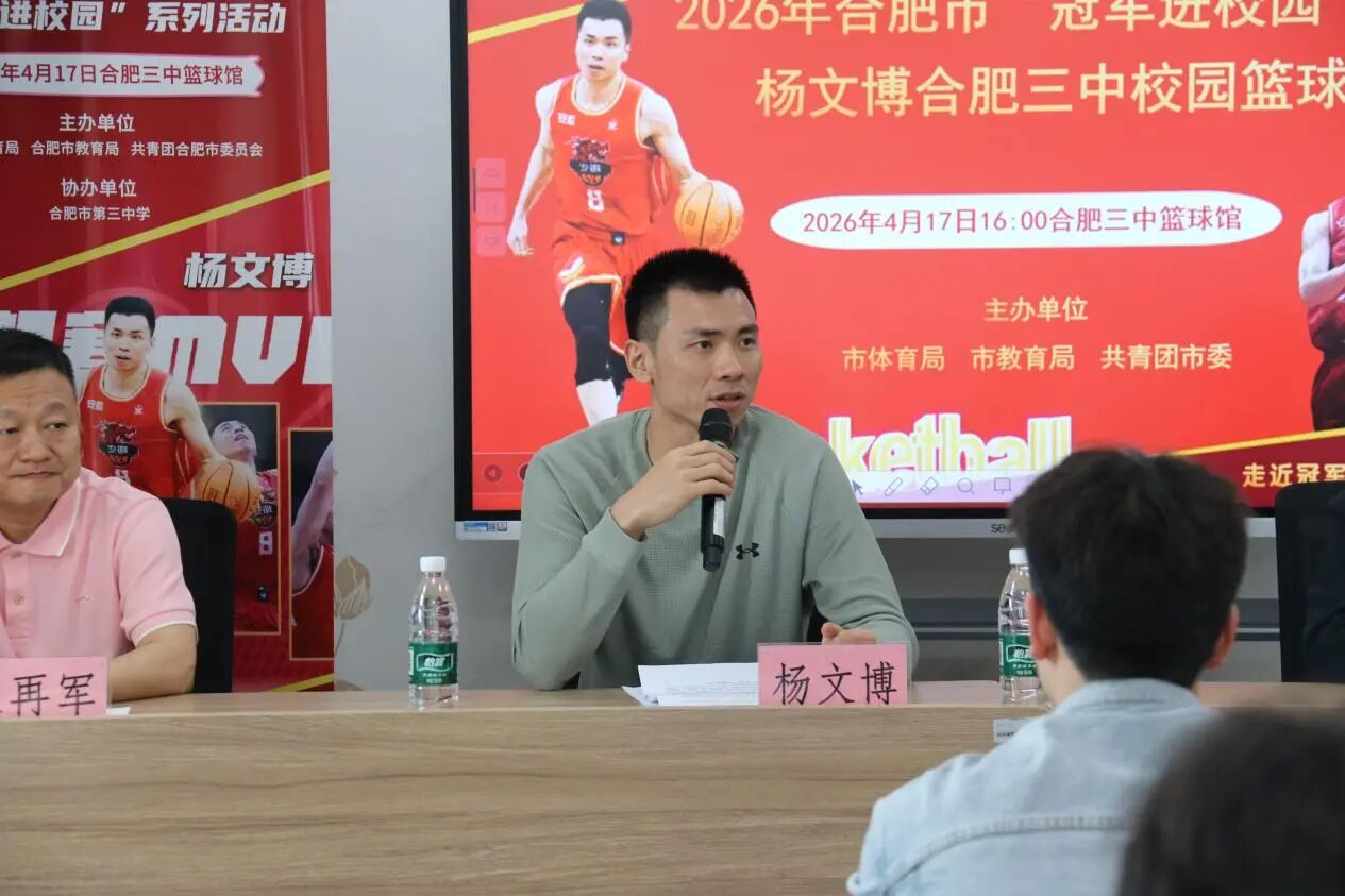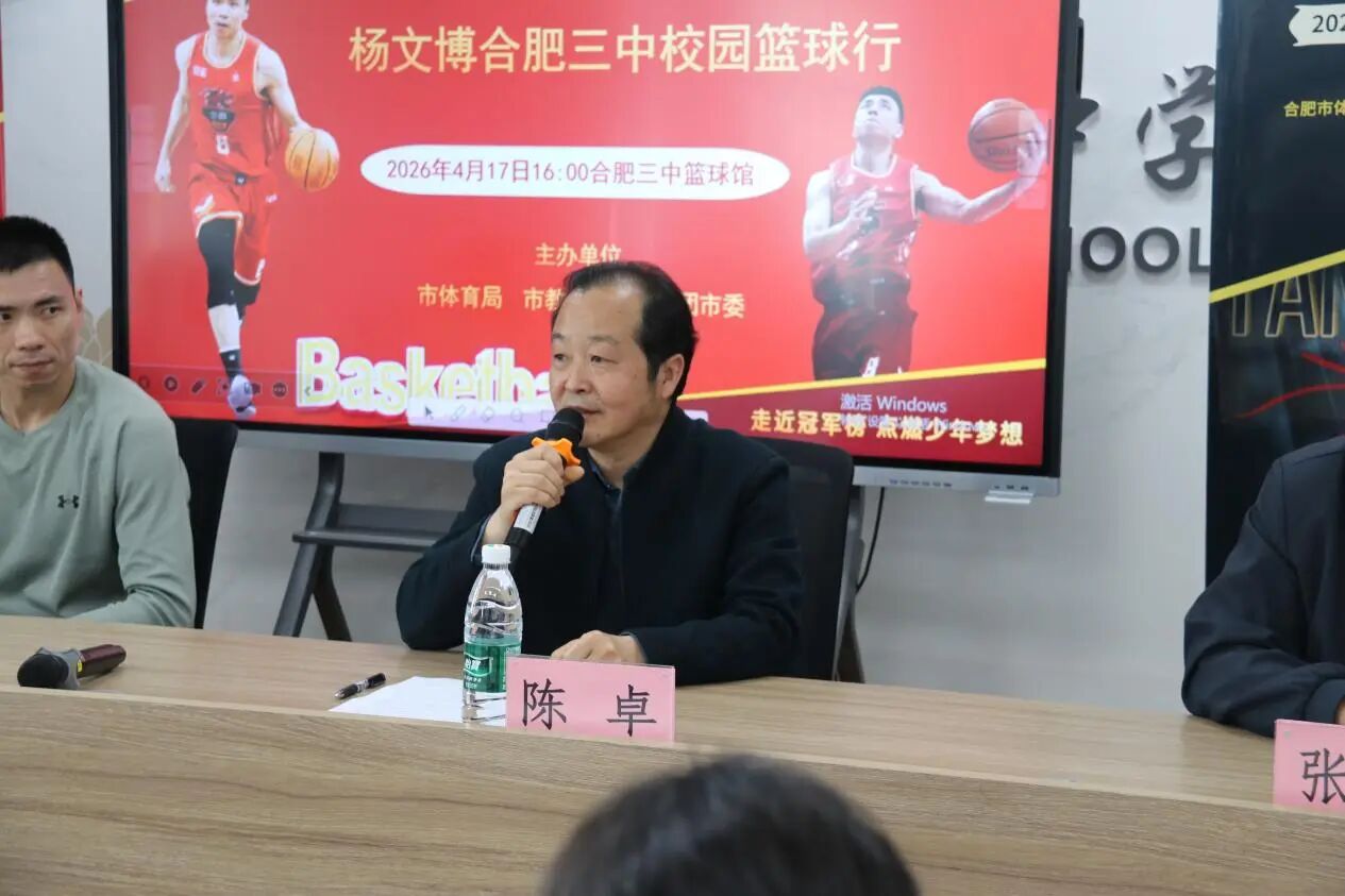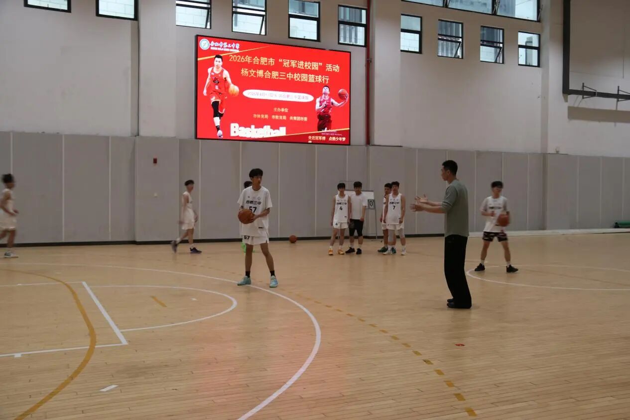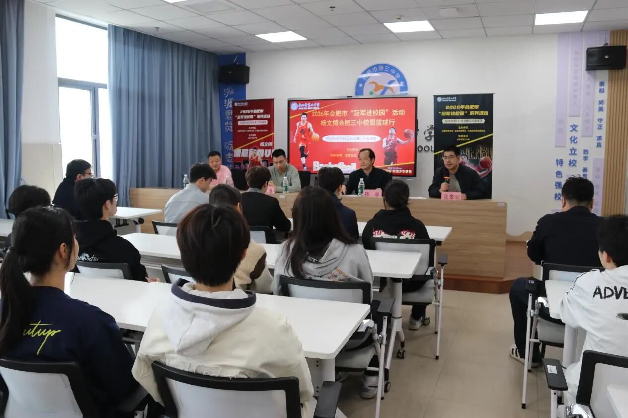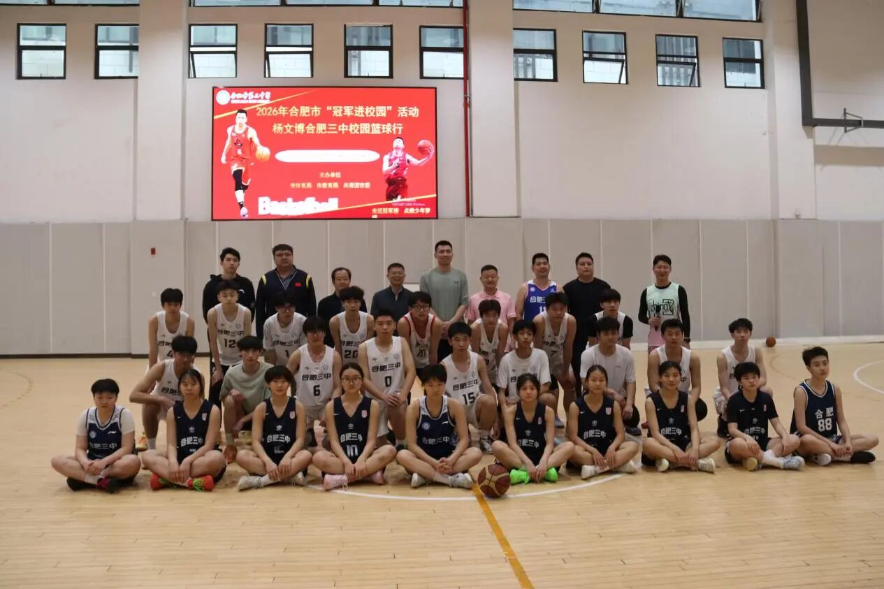 为深化体教融合发展,弘扬体育拼搏精神,助力校园篮球特色教育提质增效,2026年4月17日,2026年合肥市“冠军进校园”系列活动走进合肥市第三中学。安徽皖江龙篮球队队长、资深职业篮球运动员杨文博亲临校园,与学校男、女篮球队队员、篮球教练及体育组教师展开深度交流,以专业经验赋能青少年篮球成长,点燃校园篮球运动热情。